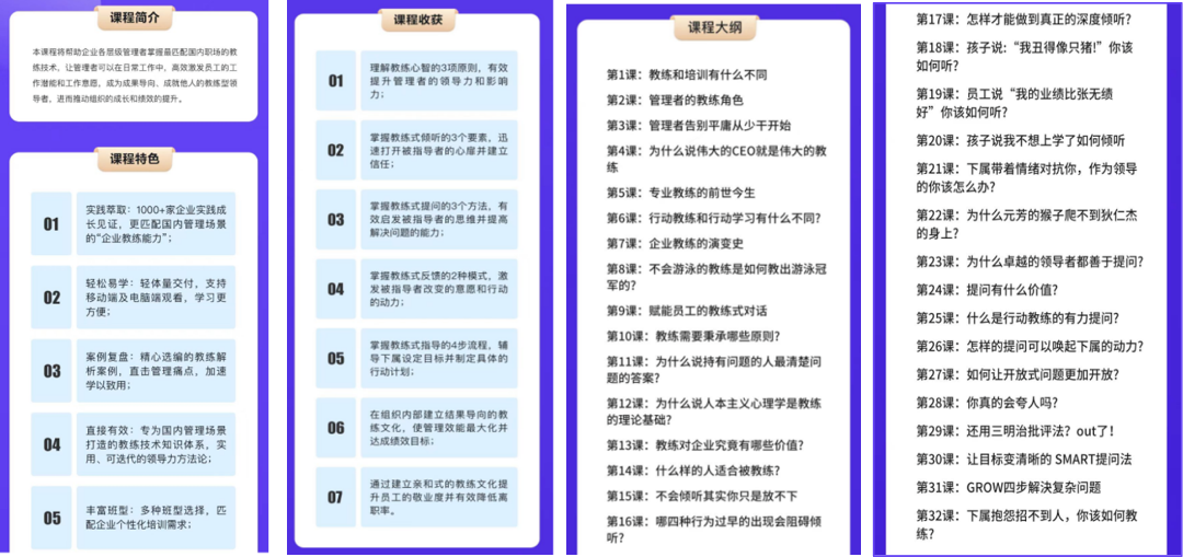 同时,为了保障教练的带教质量,本期项目中也为11位带教教练提供了《教练型领导力32讲 》在线课程学习,提升内部教练辅导能力,保证项目整体辅导效果。